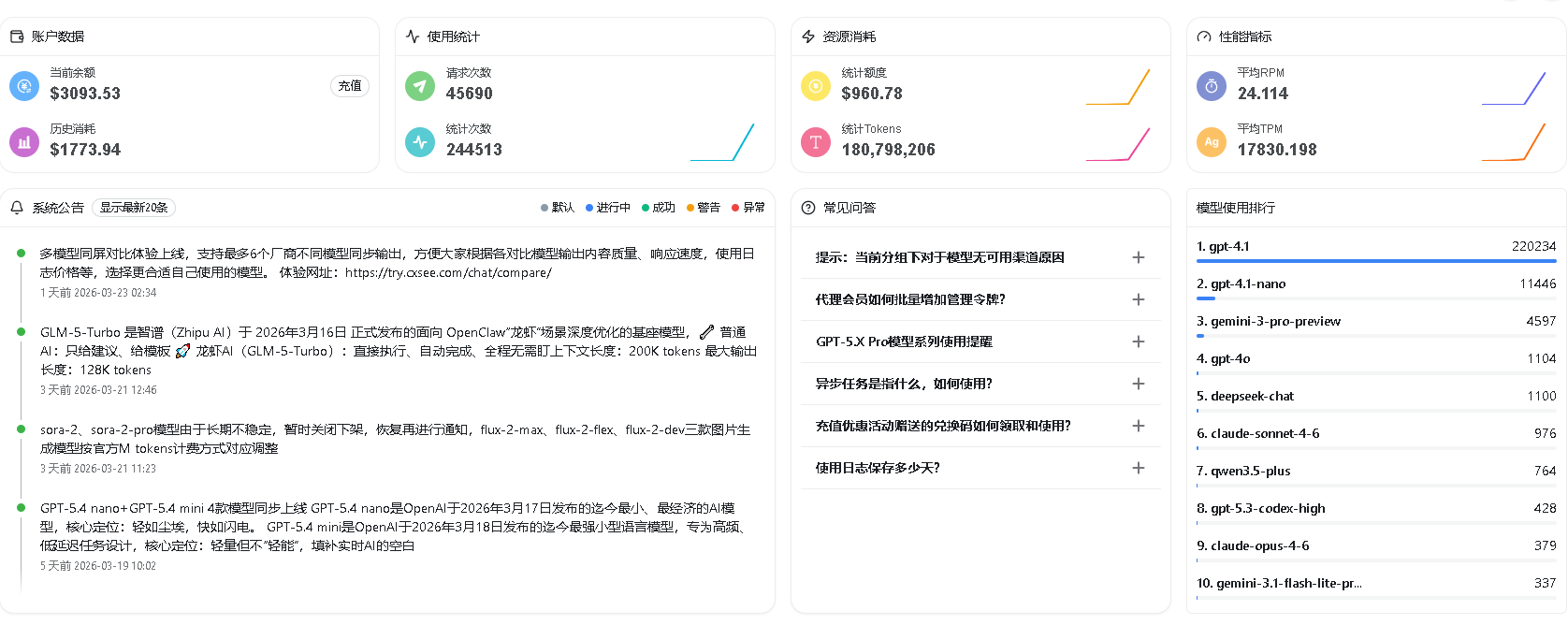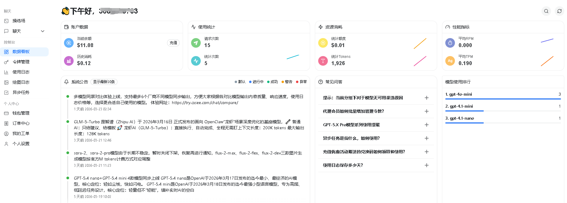 ##数据看板 工作台数据看板:在这里可以查看自己模型使用的总体统计数据 上方:包括账户数据、使用统计、资源消耗、性能指标 下方:平台系统公告、常见问题、自己7天模型使用排行  模型使用排行以7天为周期自动更新,如团队使用量大时可供参考分析