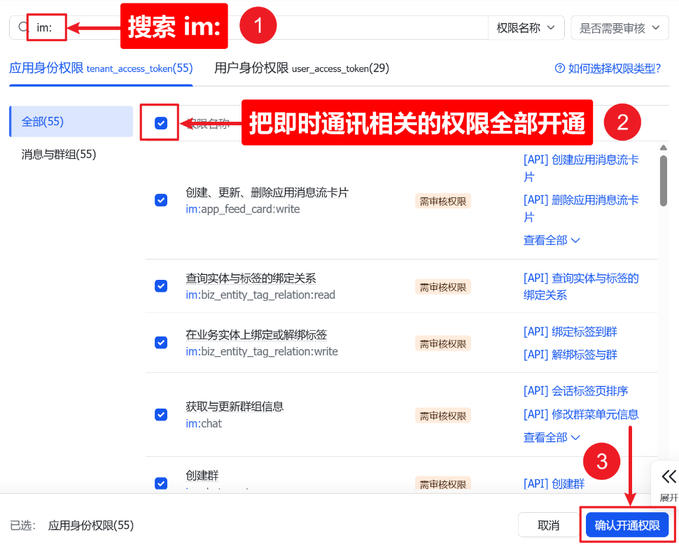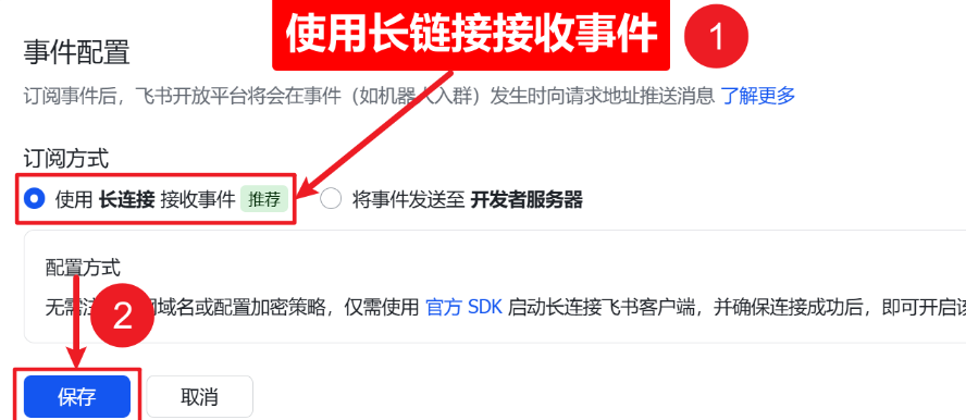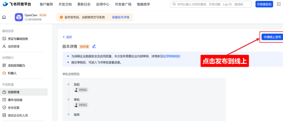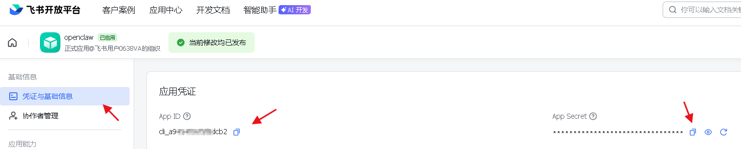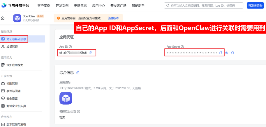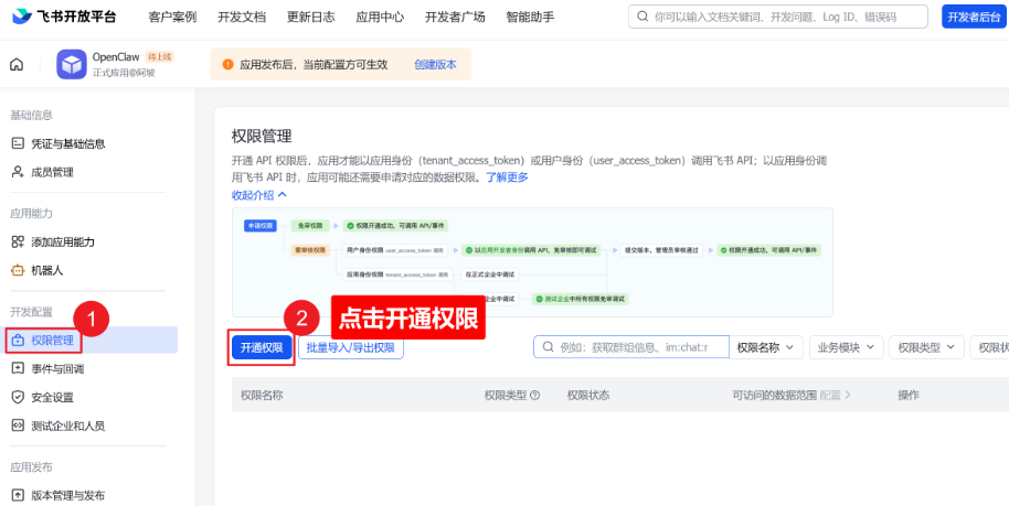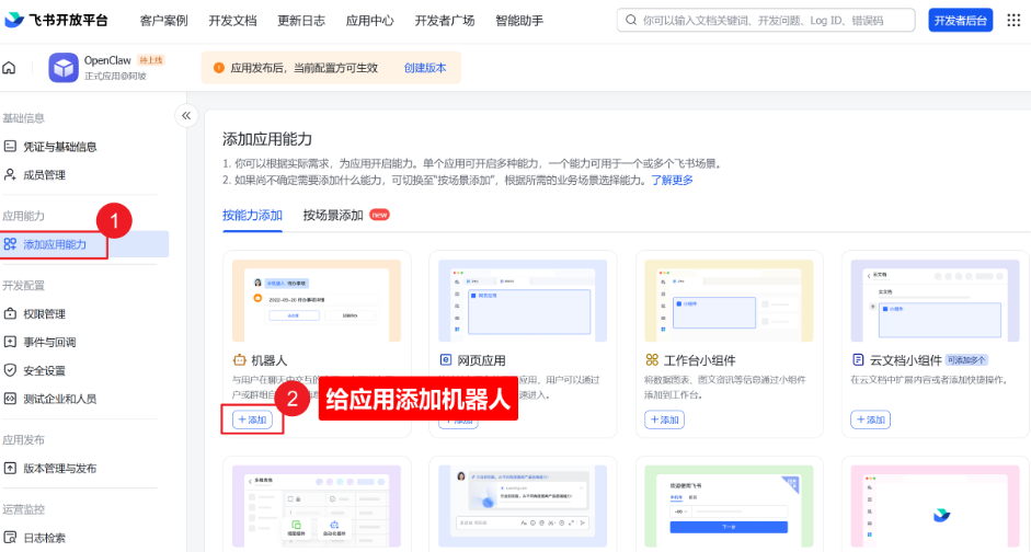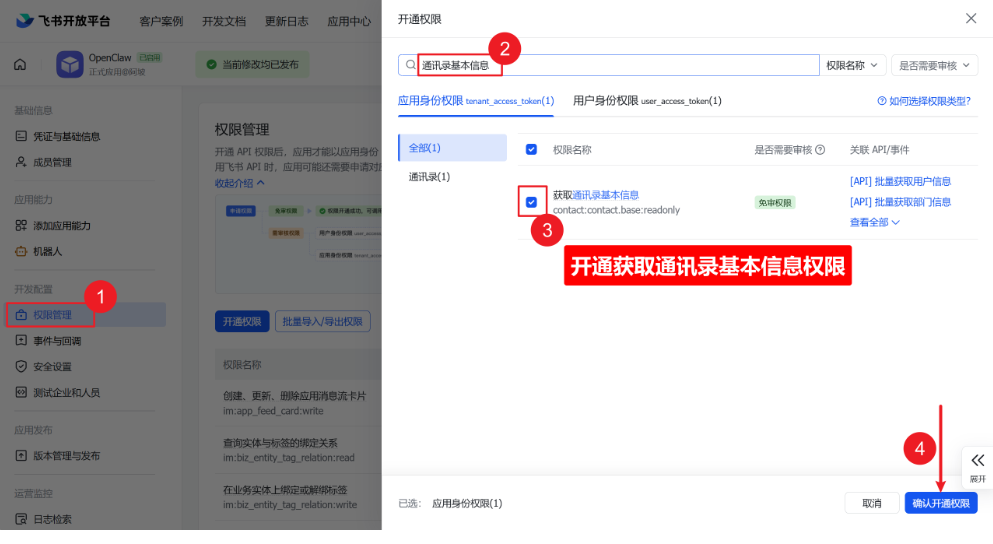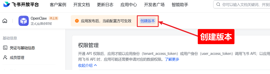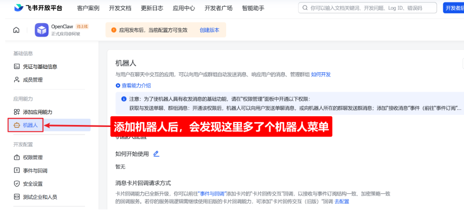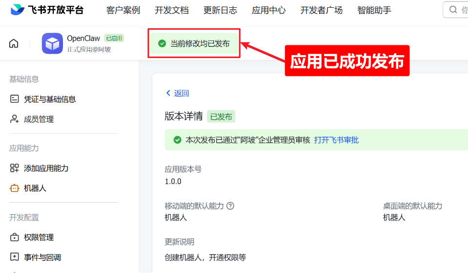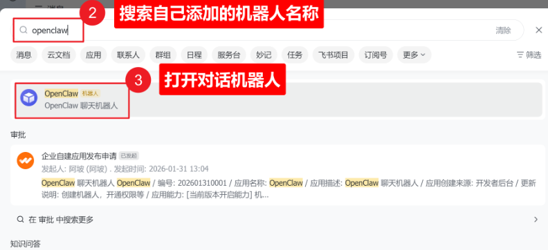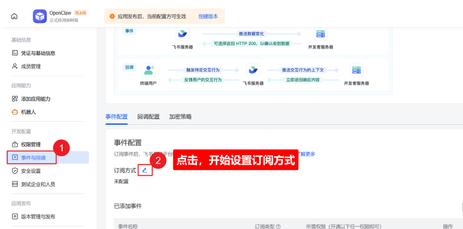#### 接入飞书机器人 该方法适用于服务器、WIN系统 我们需要先到飞书平台创建自己的机器人来接入OpenClaw: 一)来到飞书开发者后台 飞书开放平台地址:https://open.feishu.cn 没有飞书账号的,需要自己注册账号 点击右上角进入 开发者后台:  二)创建应用  三)填写应用信息  四)获取自己的应用凭证  五)给应用添加机器人   六)给应用配置权限  把即时通讯相关的权限全部开通:  七)创建版本并发布    来到飞书客户端进行审批:   八)安装飞书插件 打开powershell,输入以下命令,安装飞书插件: ```bash openclaw plugins install @m1heng-clawd/feishu ``` 安装成功后,再打开一个新的命令窗口,开始配置飞书插件: 输入命令: ```bash openclaw config ```  选择渠道:  选择配置链接:   输入飞书的AppID,AppSecrect:注意顺序是反的先输入AppSecrect   域名选择中国的:  接受群组聊天:  选择完成:  选择yes:  选择继续,完成配置:  重启服务,使配置生效: ```bash systemctl restart openclaw-gateway.service ``` 控制可以看到飞书插件已经配置成功 七)回到飞书后台设置事件回调  选择 使用长连接接收事件 :  可以看到添加事件按钮由原来的灰色不可点击变为可点击:  添加接收消息事件:  给应用开通获取通讯录基本信息的权限:  重新发布版本:  跟前面的步骤一样,发布为在线应用即可。 现在可以在 飞书中与 AI 助手对话了! 八)在飞书中与OpenClaw对话 来到飞书客户端或者手机飞书app上消息里搜索:  最后测试能不能满足基本需求结果,比如我在服务器目录放一个文件,让他读取内容  内容如下  手机端操作测试让它帮找下文件并打开内容 打开内容查看是否正确  最后到数字先锋API查看下日志,默认是调用gpt-5.3-codex模型