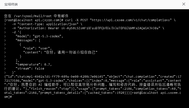 # 所有对话模型均兼容 OpenAI 格式,一键对接 请求路径 /v1/chat/completions 仅需替换 model ,即可使用 OpenAI、Claude、Gemini、DeepSeek、Grok、Qwen 等大语言模 OpenAI 兼容格式”的标准 curl 示例(可让AI帮你写) 将 YOUR_API_BASE 替换为你的服务地址 https://api.cxsee.com 将 YOUR_API_KEY 替换为用户自己的密钥 ```bash curl -X POST "https://YOUR_API_BASE/v1/chat/completions" \ -H "Content-Type: application/json" \ -H "Authorization: Bearer YOUR_API_KEY" \ -d '{ "model": "YOUR_MODEL_NAME", "messages": [ { "role": "user", "content": "你好,请用一句话介绍你自己" } ], "temperature": 0.7, "stream": false }' ``` OpenAI 兼容格式”的标准 curl 请求示例  如果不知道具体接口可到操练场发条信息,再到使用日志里查看请求路径