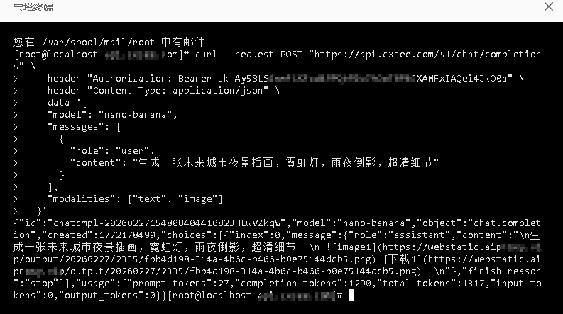 ```bash { "id": "chatcmpl-20260227154808404410823HLwVZkqW", "model": "nano-banana", "object": "chat.completion", "created": 1772178499, "choices": [ { "index": 0, "message": { "role": "assistant", "content": "生成一张未来城市夜景插画,霓虹灯,雨夜倒影,超清细节\n [下载1](https://webstatic.xxx.com/output/20260227/2335/fbb4d198-314a-4b6c-b466-b0e75144dcb5.png)" }, "finish_reason": "stop" } ], "usage": { "prompt_tokens": 27, "completion_tokens": 1290, "total_tokens": 1317, "input_tokens": 0, "output_tokens": 0 } } ``` 图像生成结果