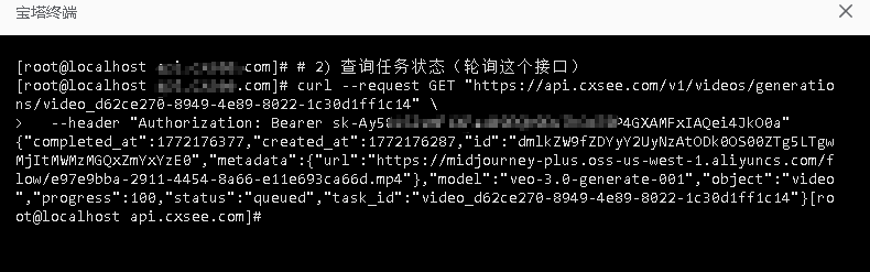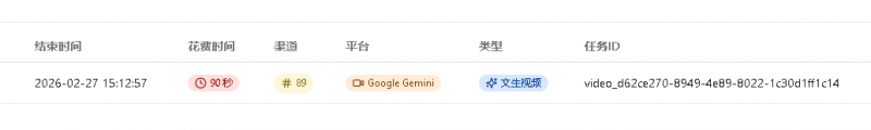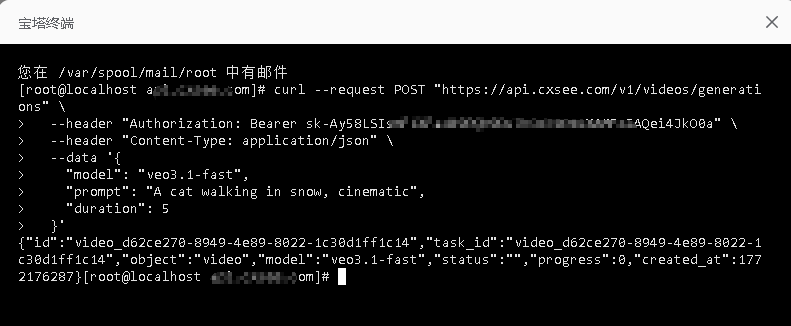 # Gemini 视频模型格式 Gemini 视频模型,且统一走 /v1/videos/generations Gemini 视频模型,且统一走 /v1/videos/generations/task_id Gemini 视频生成模型包括veo3.1-4k、veo3.1、veo3.1-components-4k、veo3.1-pro、veo3.1-fast 视频模型请求示例 ```bash # 1) 创建视频任务 curl --request POST "https://api.cxsee.com/v1/videos/generations" \ --header "Authorization: Bearer $API_KEY" \ --header "Content-Type: application/json" \ --data '{ "model": "veo3.1-fast", "prompt": "A cat walking in snow, cinematic", "duration": 5 }' ``` 创建视频任务测试示例  ```bash # 2) 查询任务状态(轮询这个接口) curl --request GET "https://api.cxsee.com/v1/videos/generations/task_id" \ --header "Authorization: Bearer $API_KEY" ``` 查询任务视频示例  工作台使用日志  任务日志(异步任务)  任务日志返回JSON ```bash { "id": 50, "created_at": 1772176287, "updated_at": 1772176476, "task_id": "video_d62ce270-8949-4e89-8022-1c30d1ff1c14", "external_task_id": "dmlkZW9fZDYyY2UyNzAtODk0OS00ZTg5LTgwMjItMWMzMGQxZmYxYzE0", "platform": "24", "user_id": 1, "group": "default", "channel_id": 89, "quota": 50000, "action": "textGenerate", "status": "succeeded", "fail_reason": "https://midjourney-plus.oss-us-west-1.aliyuncs.com/flow/e97e9bba-2911-4454-8a66-e11e693ca66d.mp4", "submit_time": 1772176287, "start_time": 1772176293, "finish_time": 1772176377, "progress": "100%", "properties": { "input": "", "upstream_model_name": "veo3.1-fast", "origin_model_name": "veo3.1-fast" }, "data": { "cost": 0.2, "data": { "output": "https://midjourney-plus.oss-us-west-1.aliyuncs.com/flow/e97e9bba-2911-4454-8a66-e11e693ca66d.mp4" }, "action": "google-videos", "status": "SUCCESS", "task_id": "video_d62ce270-8949-4e89-8022-1c30d1ff1c14", "platform": "google", "progress": "100%", "start_time": 1772176297, "fail_reason": "", "finish_time": 1772176377, "search_item": "", "submit_time": 1772176286 }, "timestamp2string": "2026-02-27 15:11:27", "key": "50" } ``` 视频结果